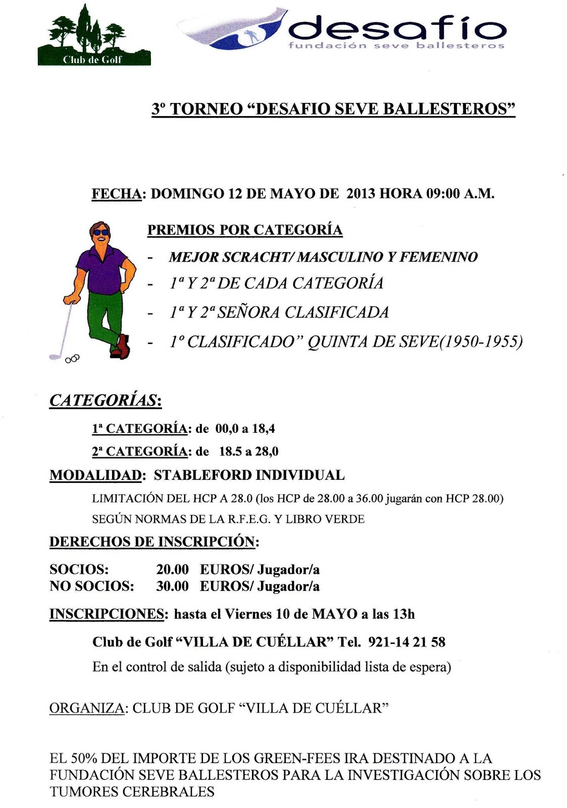 El próximo 12 de Mayo de 2013 se celebrará en nuestro Club de Golf Villa de Cuéllar el tercer torneo «Desafío Seve Ballesteros», en colaboración con su fundación. Contamos con vuestra participación. A continuación publicamos el cartel de la cita: