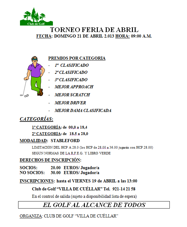 El próximo Domingo 21 de Abril se celebrará en Club de Golf Villa de Cuéllar el Torneo Feria de Abril, donde esperamos contar con vuestra participación.
