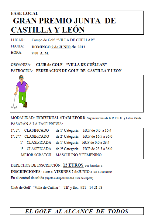 El próximo Domingo 9 de Junio de 2013 se celebrará en Club de Golf Villa de Cuéllar (Segovia) el torneo Gran Premio Junta de Castilla y León, patrocinado por la Federación de Golf de Castilla y León. Os animamos a todos a participar. A continuación publicamos el cartél del torneo: