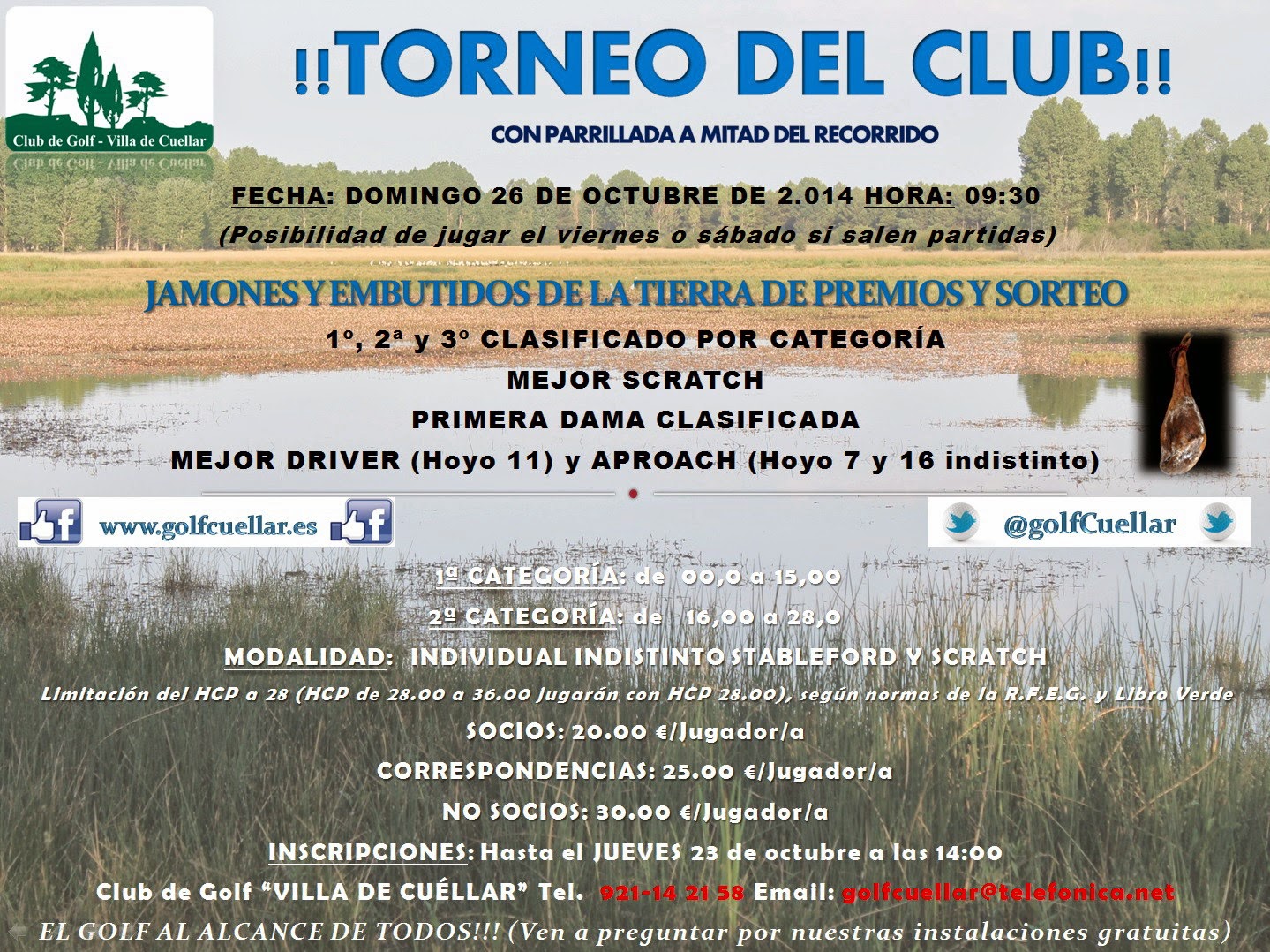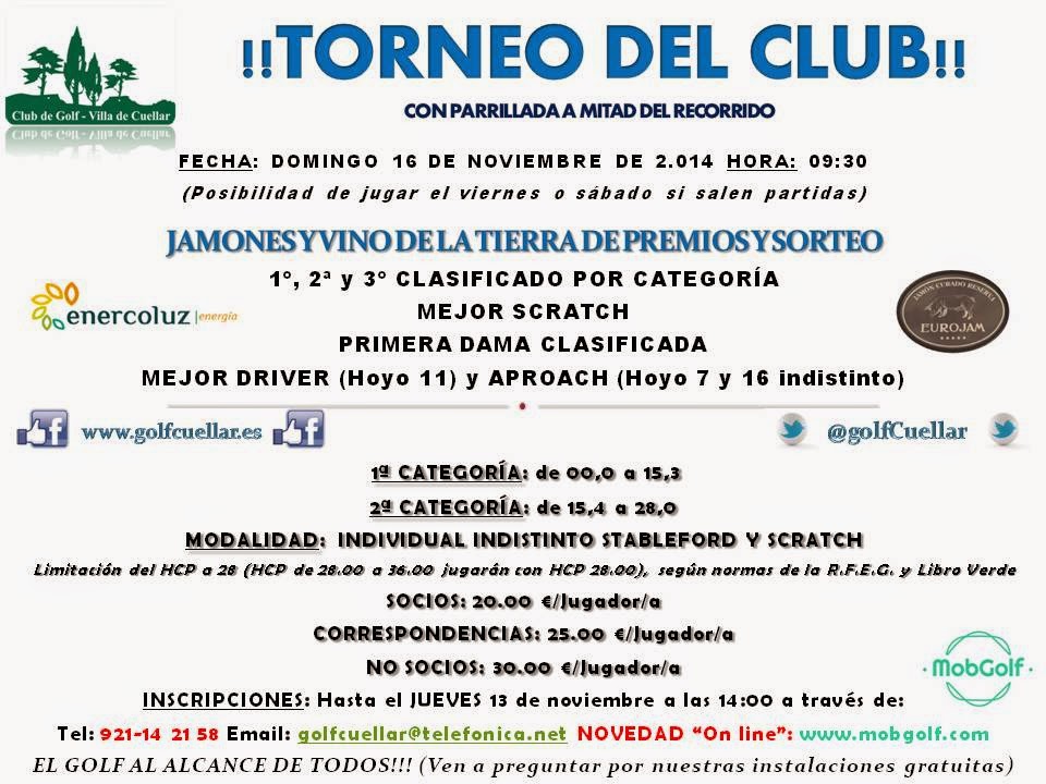 Continuando con el calendario de Torneos del 2014 del Club de Golf Villa de Cuéllar, le comunicamos que este fin de semana del 24 al 26 de octubre, celebramos un Torneo del Club con la ya tradicional parrillada del hoyo 9.