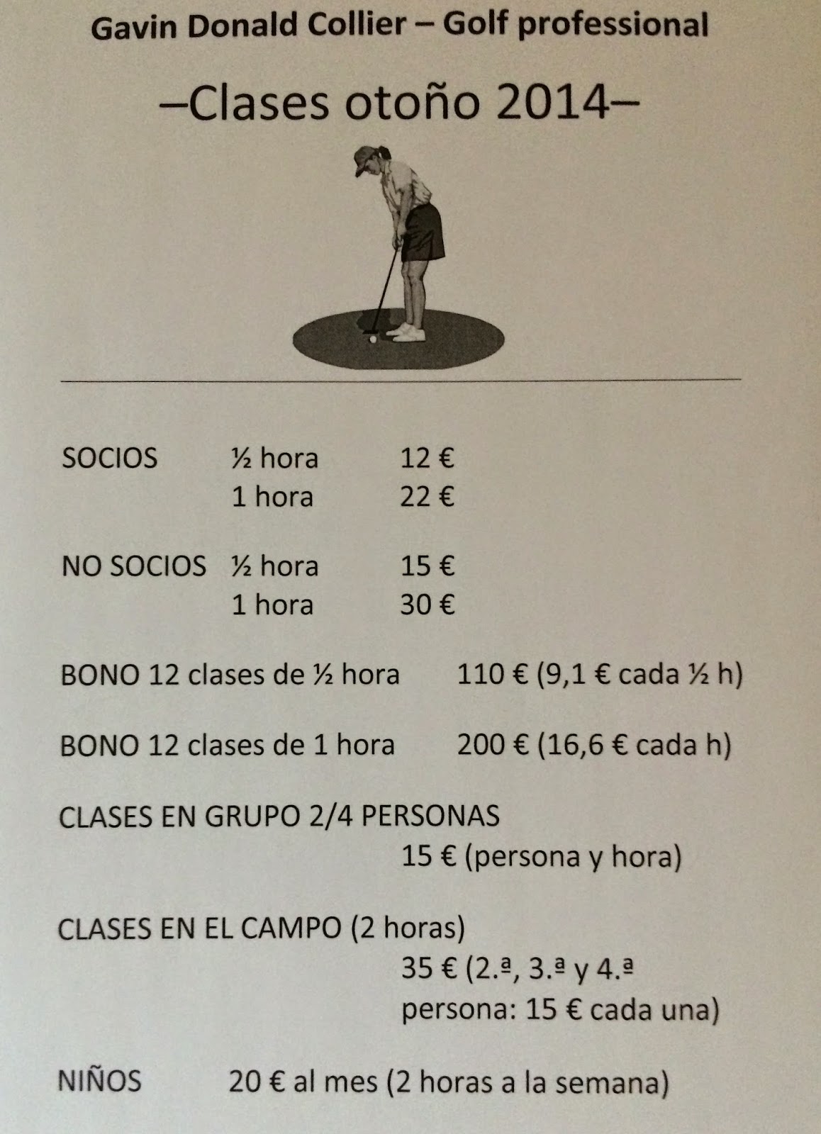 Las clases de golf en el Club de Golf Villa de Cuéllar son impartidas por el prestigioso profesor escocés Gavin Donald Collier. A continuación detallamos las tarifas especiales establecidas para este otoño 2014: