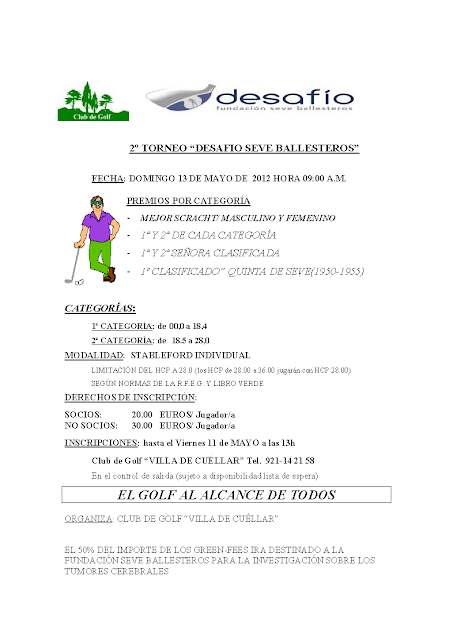 El próximo Domingo día 27 de Mayo (también se podrán hacer salidas el Sábado 26) se celebrará en Club de Golf Villa de Cuéllar el Torneo «José Rodríguez González». Dado el carácter benéfico del torneo, solicitamos todo vuestro apoyo y contamos con vuestra participación.