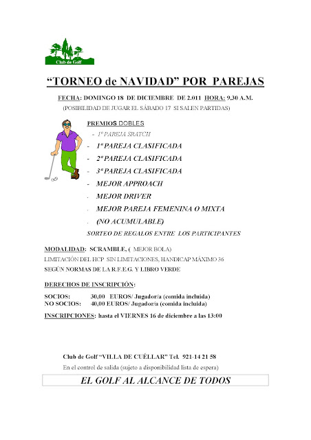 El próximo Domingo 18 de Diciembre de 2011 para completar el año golfístico, se celebrará el habitual Torneo de Navidad (no os lo perdáis).
