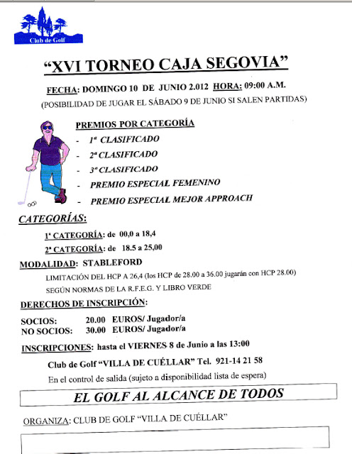 Continuan los torneos en Club de Golf Villa de Cuéllar (Segovia). El próximo será el ya tradicional «Torneo Caja Segovia» que ya cumple su decimo sexta edición, por tanto, todo un clásico entre los torneos del Club. En concreto, en esta ocasión se celebra los días Sábado 9 y Domingo 10 de Junio. Contamos como siempre con vuestra participación.
