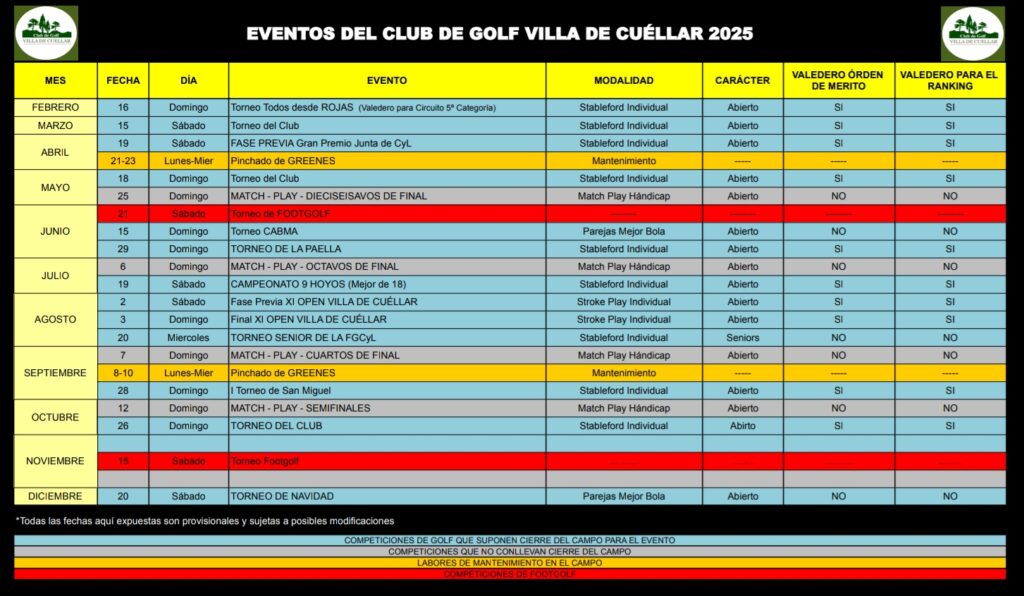Aqui os dejamos los torneos que se celebrarán en nuestro campo en 2025. Los torneos se pueden modificar por motivos del campo. Hay torneos que el campo estará abierto para jugar, informarse en el club antes.